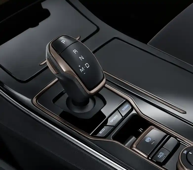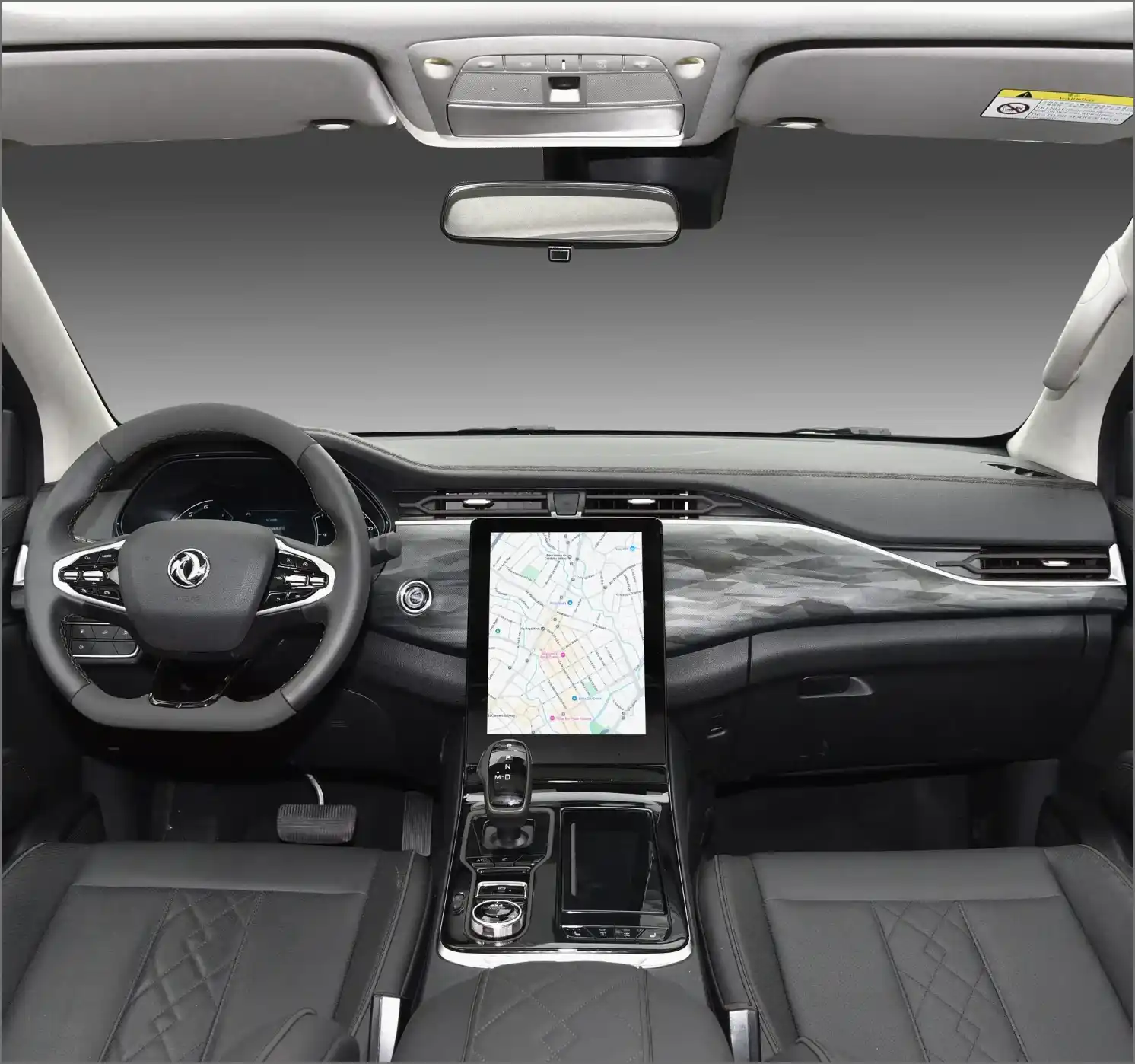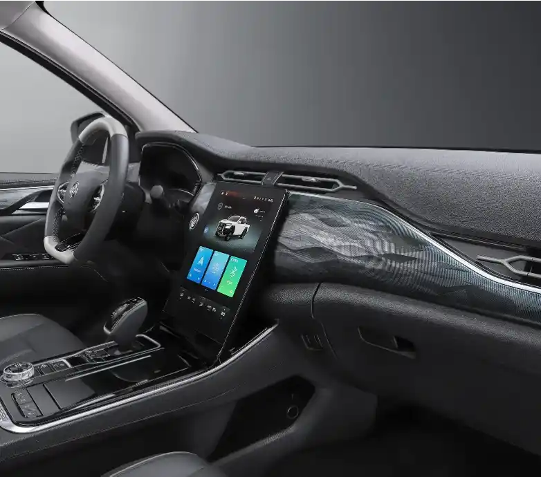 Interior tipo cuero + controles al volante + pantalla táctil de 13″ + volante ajustable + entrada sin llave con botón de arranque.